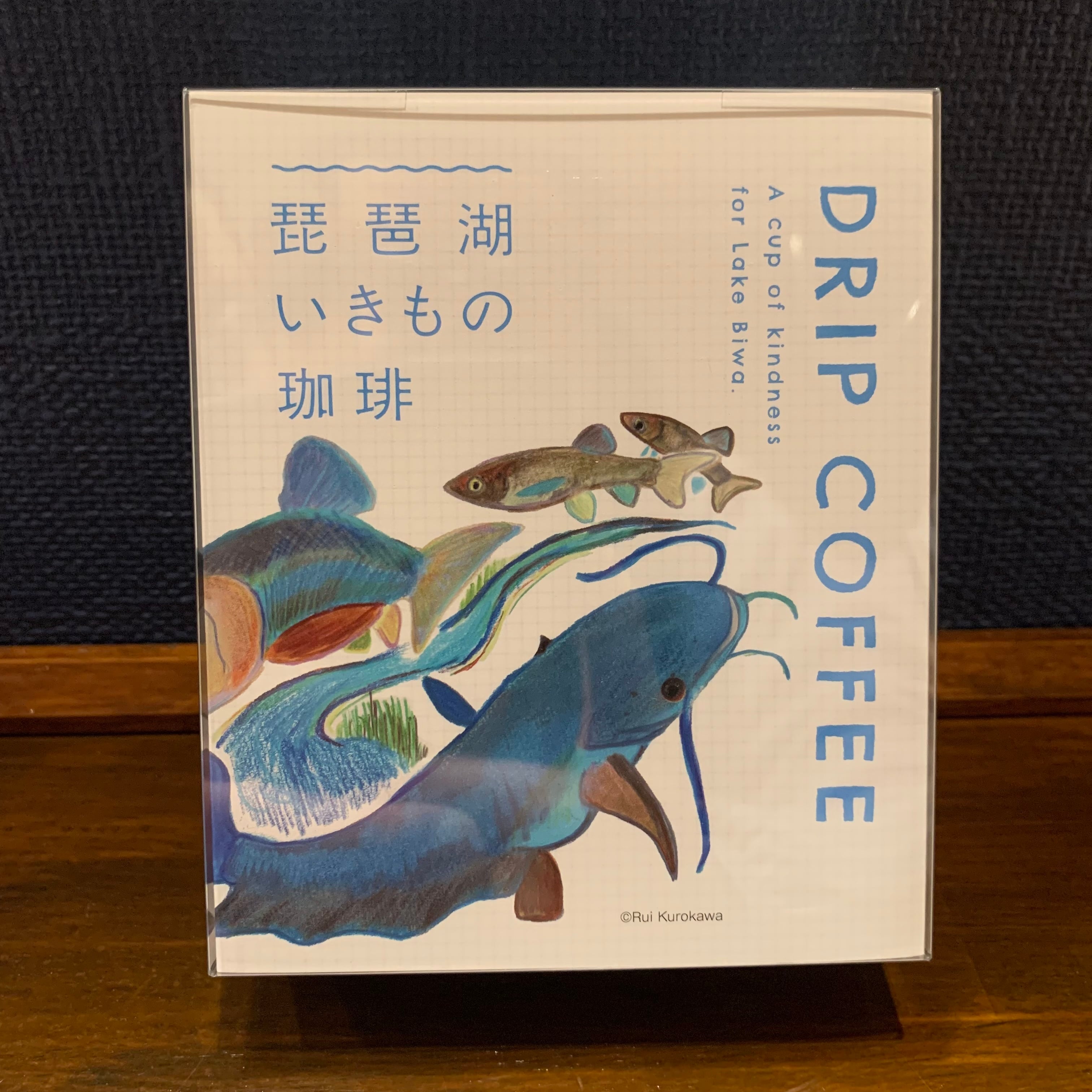 琵琶湖と琵琶湖に生きる生き物を身近に感じていただけるよう、滋賀県在住の黒川琉伊さん(著「はじめてのびわこの魚」(能美舎))に書き下ろしで描いていただいたイラストを琵琶湖いきもの珈琲の全体に映し出し世界観を整えました。